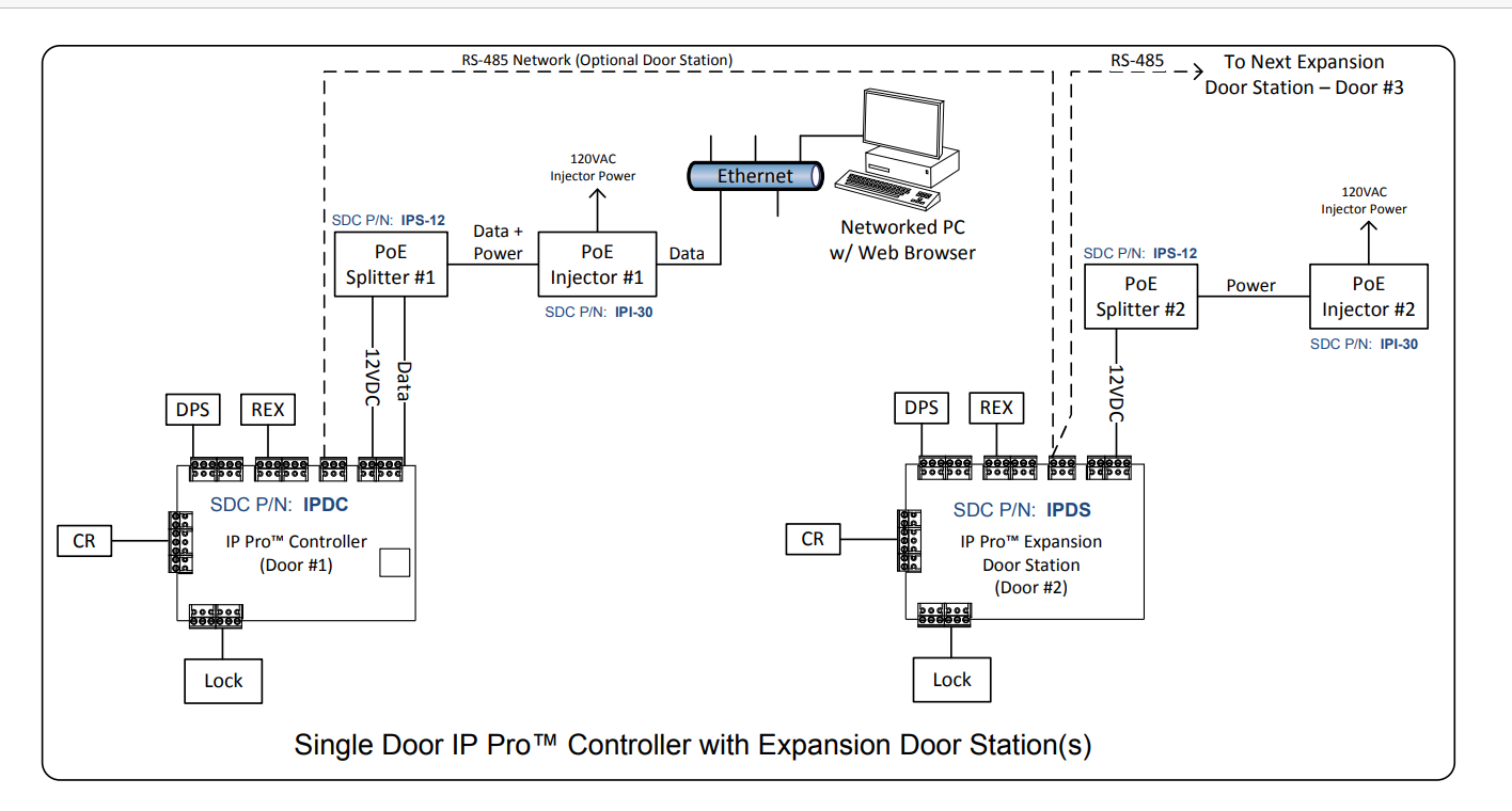 SDC IPPro® IPD series IP-based single door access controllers come with two ethernet ports for interfacing with an additional IP device. They allow expansion from one standalone door up to a 100-door “grid.” The additional ethernet port allows IT departments to save a port when connecting an extra door at the server. Installers can eliminate a long cable run when connecting an additional IP device.