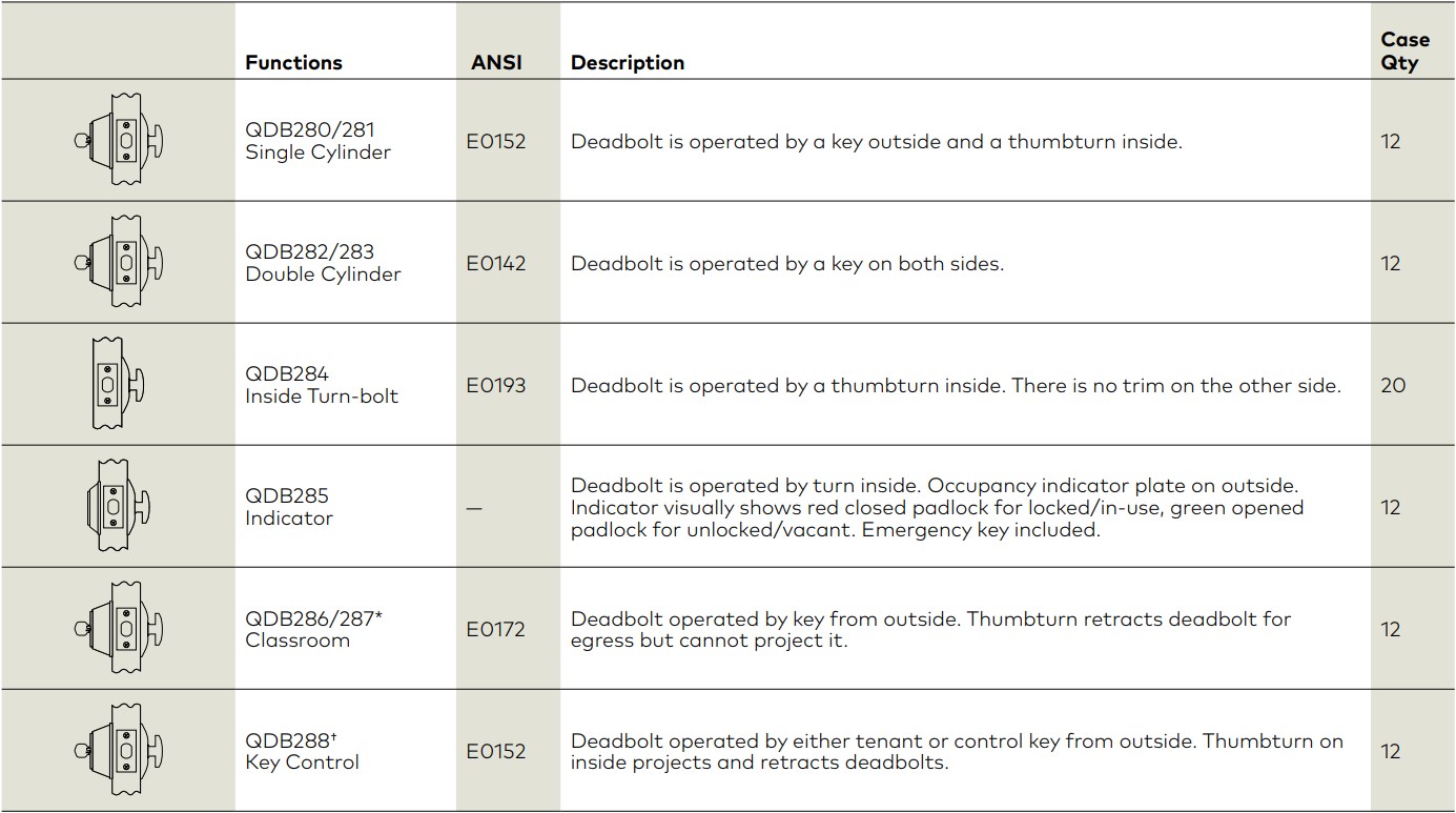 - Choose deadbolts with a SFIC option or keep your existing small format cores and use them with QDB200 series products. Standard door preparation makes retrofit quick and easy.